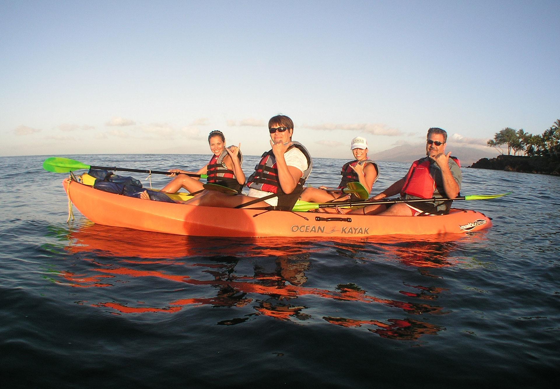 “John took the four of us out on a fantastic personal kayak tour. It was amazing! It was just me, my sister, and our spouses, and it was leisurely, fun, exhilarating, and entertaining. Going with just our own little group meant that when we lagged behind my sister’s kayak, we didn’t sweat it. I don’t mind making HER wait, the way I’d mind making strangers wait. And likewise, she didn’t mind waiting for me and my husband to catch up at a pace that was comfortable for us! We really appreciated the low-key and private approach. The snorkeling was simply amazing! My husband had had a bad experience the day before snorkeling, and wasn’t too keen on it. John had some really good suggestions, and my husband ended up LOVING it! We saw tons of fish, and a whole bunch of sea turtles. John was able to point out some distant humpback whales and their calves to us, as well. I have already recommended John and Hawaiian Paddle Sports to one friend, and I can heartily recommend it to anyone who happens by this page! It was well worth the money and early wake up call :)” – Kimberly